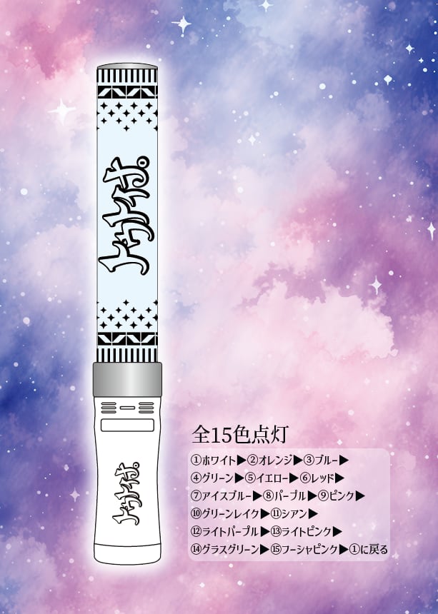 発光順:①ホワイト→②オレンジ→③ブルー→④グリーン→⑤イエロー→⑥レッド→⑦アイスブルー→⑧パープル→⑨ピンク→⑩グリーンレイク→⑪シアン→⑫ライトパープル→⑬ライトピンク→⑭グラスグリーン→⑮フーシャピンク→(①ホワイトに戻る)